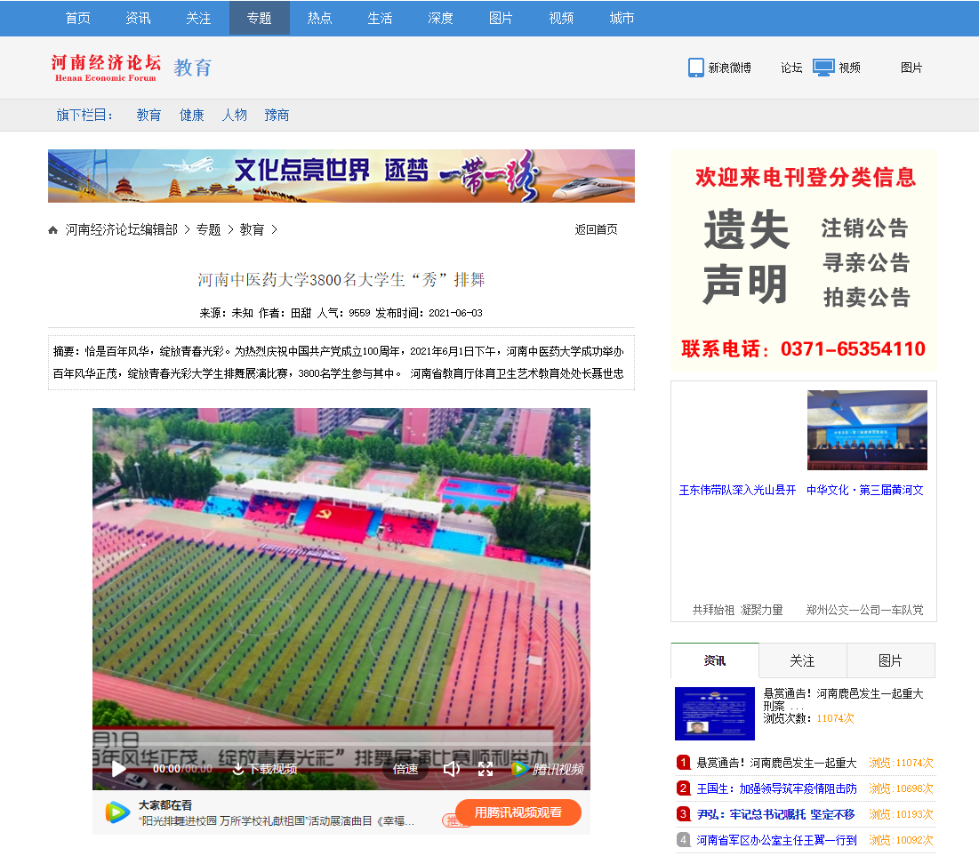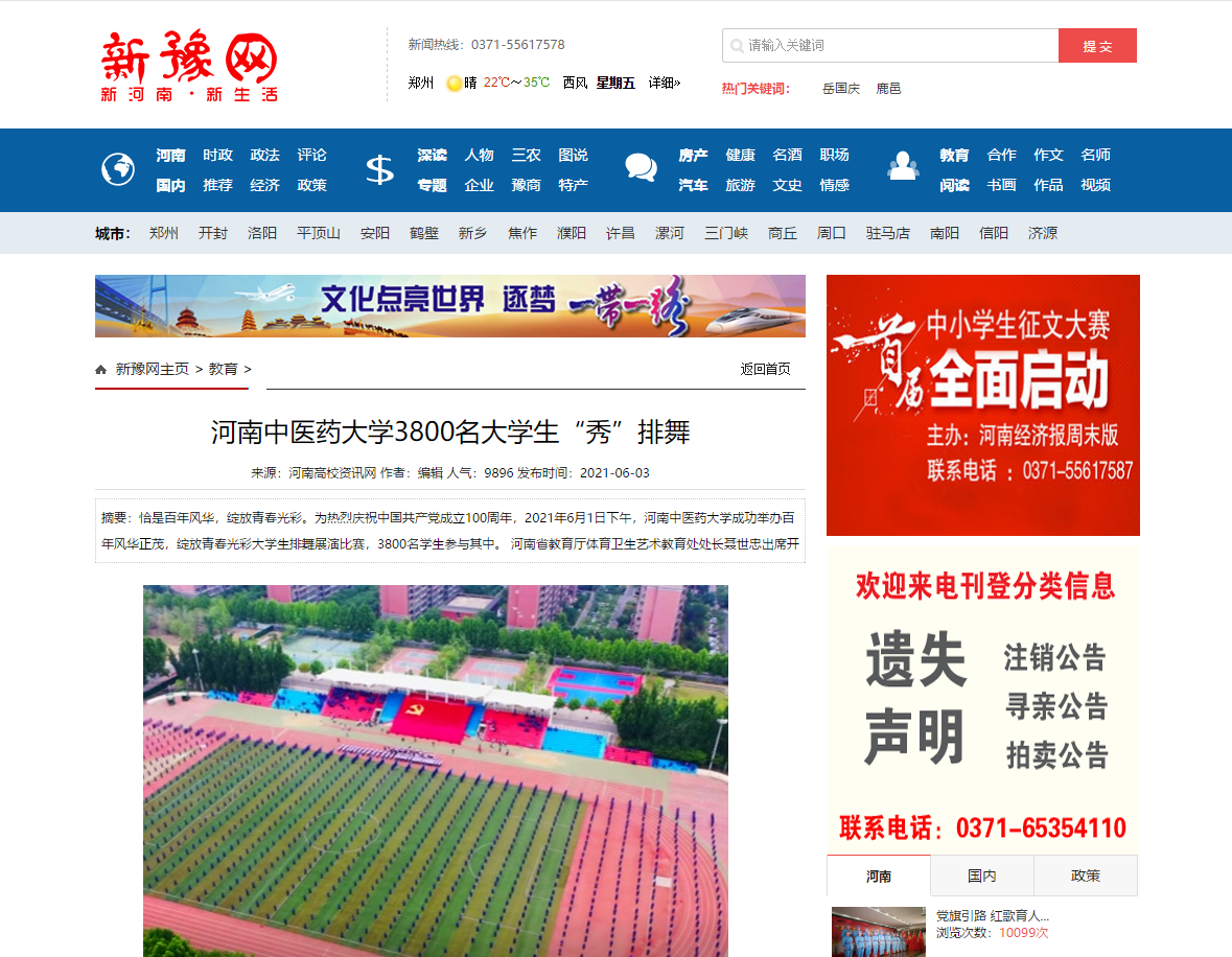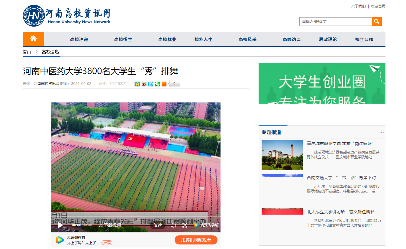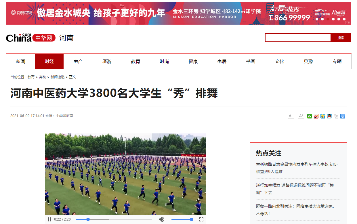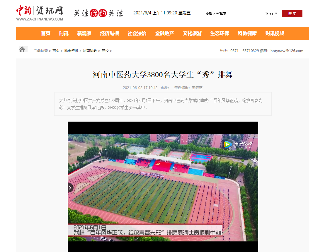 编者按:2021年6月2日-3日,人民日报客户端、中华网、中华高校网、河南高校资讯网、中新资讯网、新豫网、河南经济论坛、河南高校行等多家媒体对我校3800名大学生参加“百年风华正茂 绽放青春光彩”大型排舞展演进行报道。
