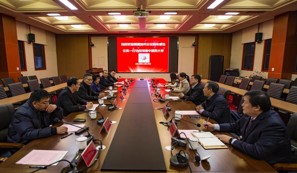 座谈会上,许二平对朱感生一行来校访问表示欢迎,向来宾详细介绍了我校的办学历史及现状,尤其是近年来在教学、科研、医疗、国际交流合作等方面取得的成绩。他表示,河南是中医药文化的主要发祥地,有着丰富的中医药文化资源,中医药在治疗肿瘤、艾滋病、免疫性疾病等重大疾病方面有突出的优势。我校非常重视中医药在人才培养、科学研究、医疗服务等多方面的对外合作与交流,一直致力于积极培养具有国际视野的优秀人才,促进我校中医药优势资源“走出去”,并将国外的优质资源“引进来”。他希望通过这次来访能与加州建立起良好的合作关系,促进中医药在美国的发展。朱感生先生是加州很有威望华人议员,也是中医药文化的积极推动者。他表示,近年来中医药在美国越来越受重视,中医针灸在美国是合法的,但是中医从业者水平参差不齐,执业环境有待改善。他希望未来与我校在中医人才培养、师资培训、医疗服务等方面进行合作,共同推动中医药在加州的发展。李书东也表示希望与我校建立良好的合作交流关系,将双方的合作步步深入,共同促进中医药文化的传播。