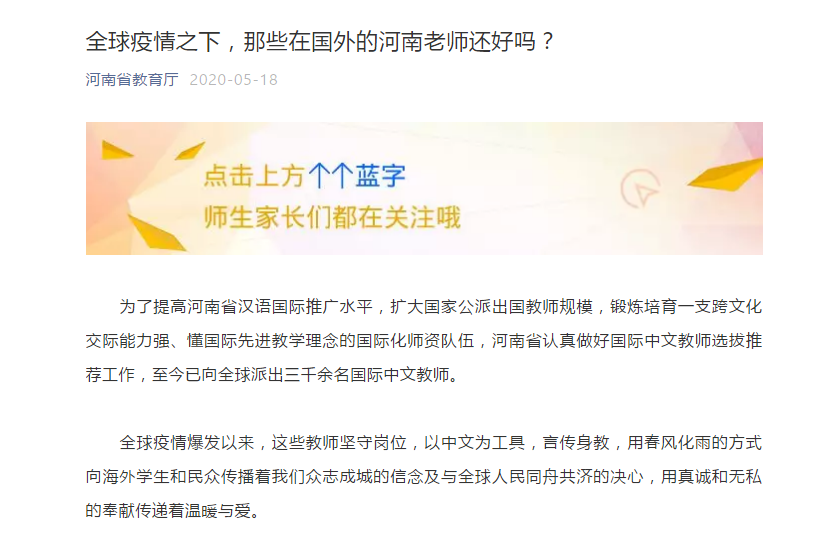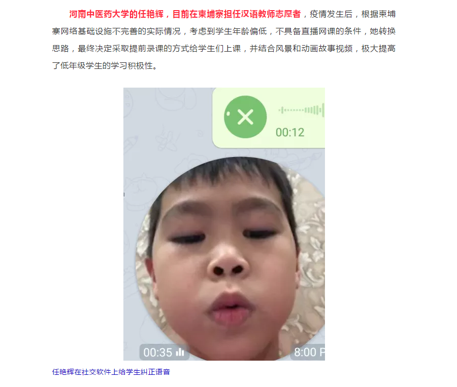 本网讯(文图/赵俊卿)近日,河南省教育厅微信公众号对我校汉语教师志愿者任艳辉在疫情期间坚守在柬埔寨教学一线岗位的事迹进行了报道。任艳辉是我校汉语国际教育专业2014级本科生毕业生,自2018年8月起赴柬埔寨任汉语教师志愿者,在近两年的教学中,她与柬埔寨学生相处融洽,见证了柬埔寨学生汉语学习过程中的点点滴滴,与任教学校师生结下了深厚的友谊。