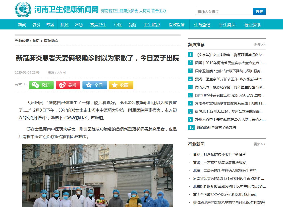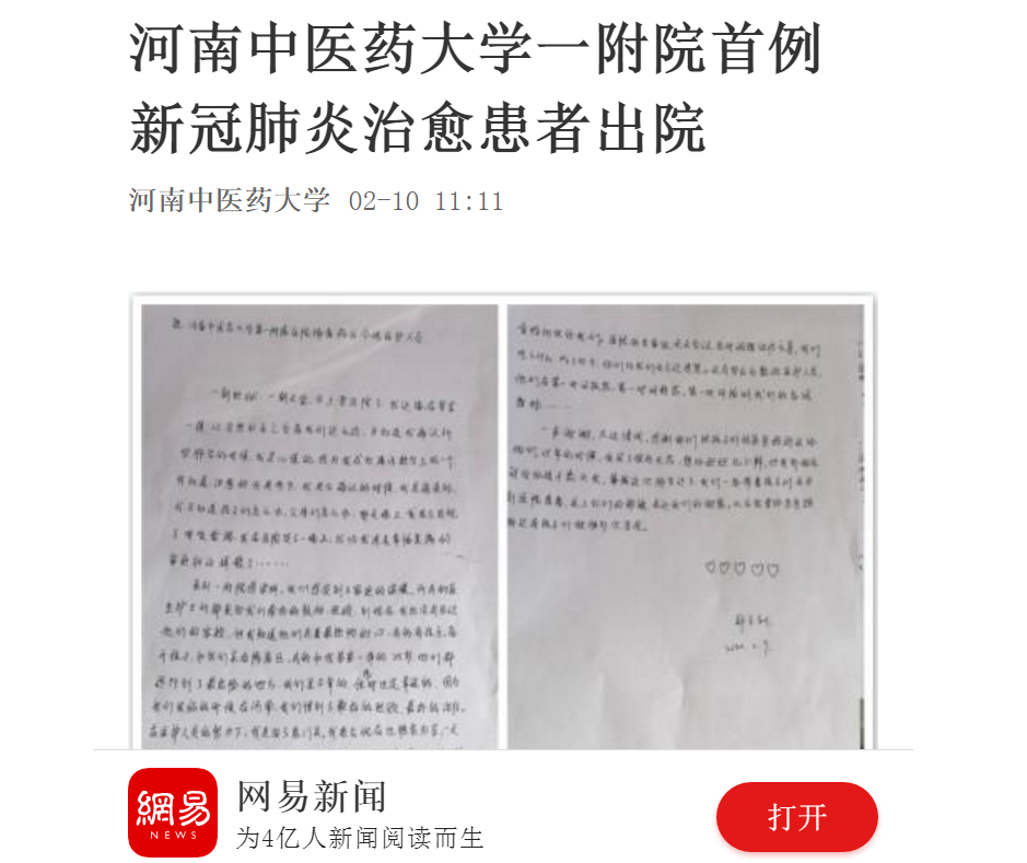 编者按:2020年2月10日,河南卫生健康新闻网、网易新闻对我校一附院首例新冠肺炎治愈患者出院进行报道。现将网易新闻全文刊发如下: