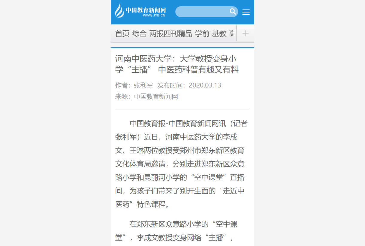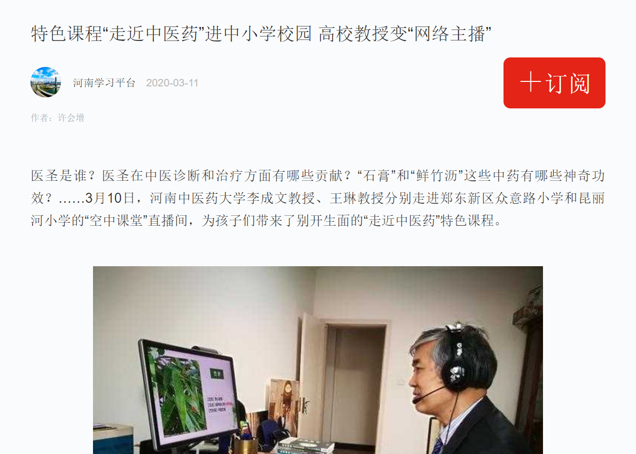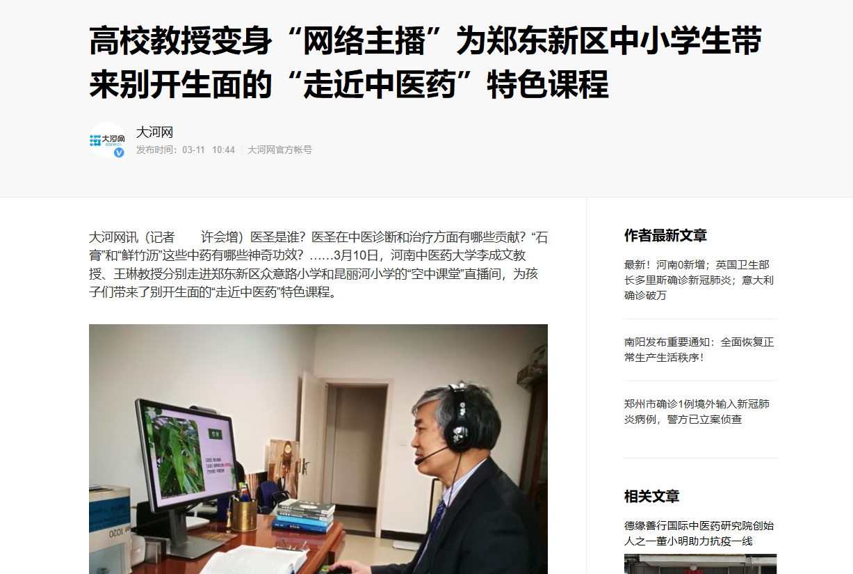 编者按:2020年3月11日-13日,学习强国、中国教育新闻网、大河网对我校李成文教授、王琳教授为郑东新区众意路小学和昆丽河小学的孩子们进行“走近中医药”特色网络直播进行报道。现将大河网全文刊发如下: