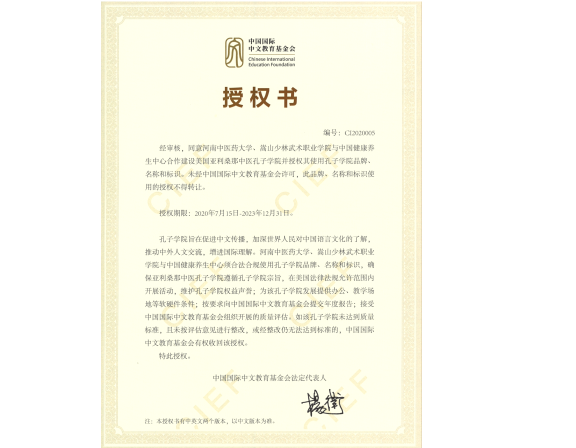 本网讯(文图/李敬平)近日,由我校、嵩山少林武术职业学院与亚利桑那中国健康养生中心共同申办的美国亚利桑那中医孔子学院正式获得中国国际中文教育基金会(以下简称“基金会”)授权成立。美国亚利桑那中医孔子学院是全省第一所获批的特色孔子学院,开启了河南省参与共建中医特色孔子学院的先河。