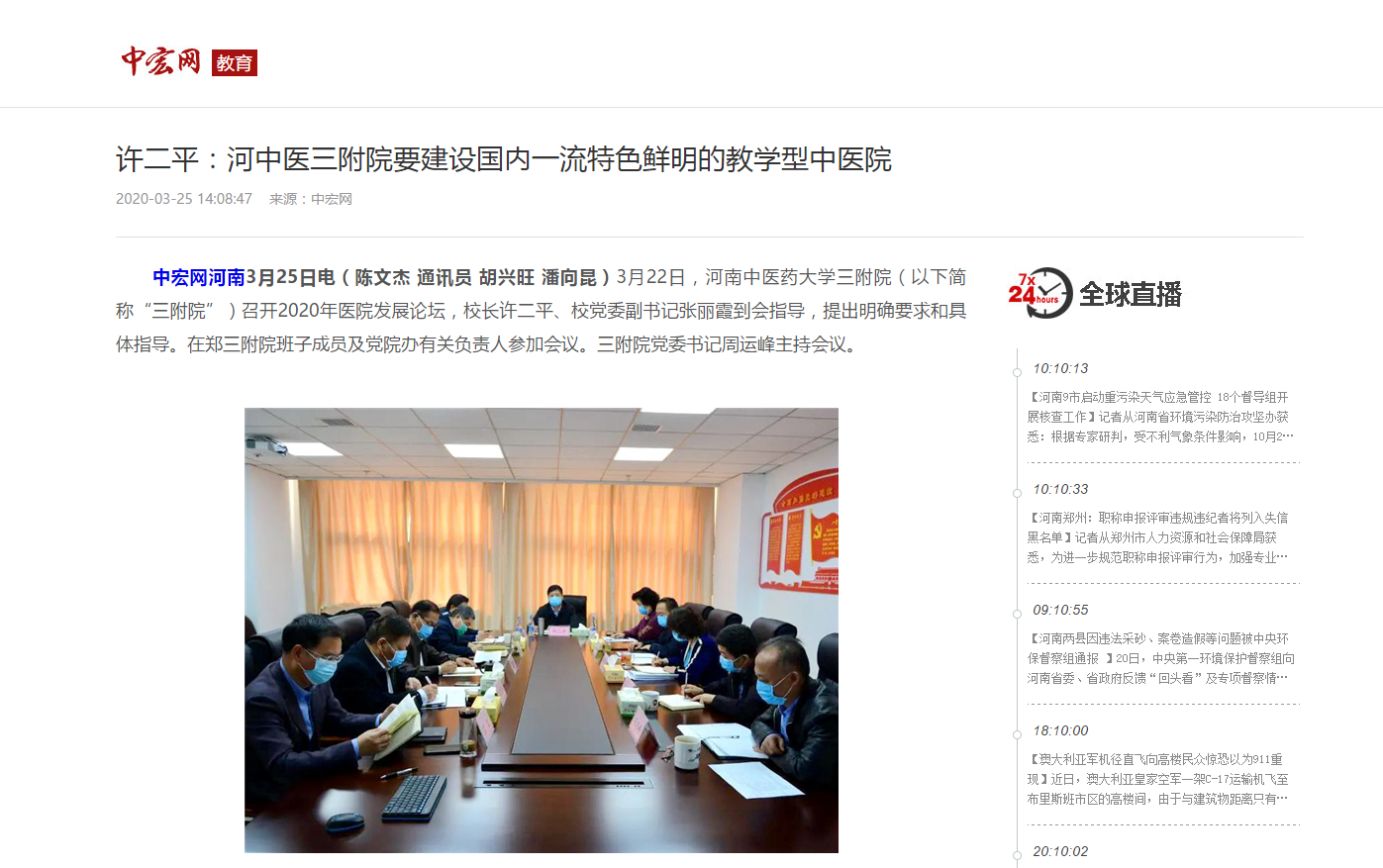 2020年3月25日,中宏网以《许二平:河中医三附院要建设国内一流特色鲜明的教学型中医院》为题,对校长许二平指导三附院2020年医院发展论坛进行报道。