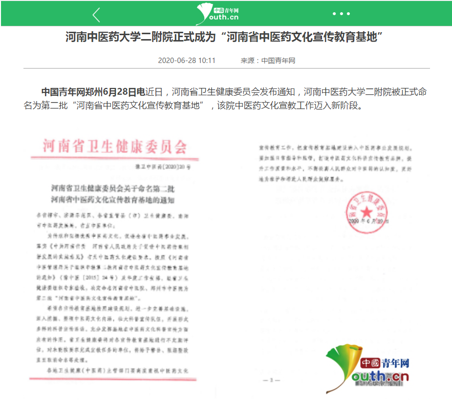 2020年6月28日,中青网对我校二附院正式成为“河南省中医药文化宣传教育基地”进行报道。