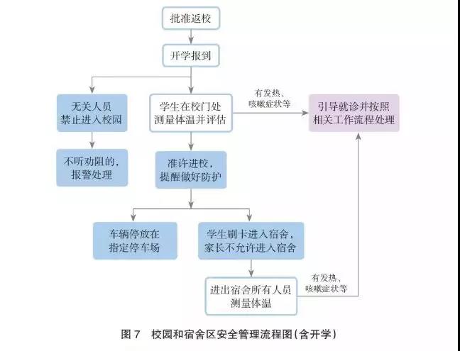 正式返校后,学生不得外出,“一日三报告”准确掌握学生动态;师生传阅文件均需洗手、佩戴口罩,课堂授课,师生一律佩戴口罩;宿舍实行封闭式管理,须实名认证、检测体温方可进入,谢绝访客;食堂就餐间隔1米以上,禁止校外外卖入校;乘坐班车的人数按承载量减半。