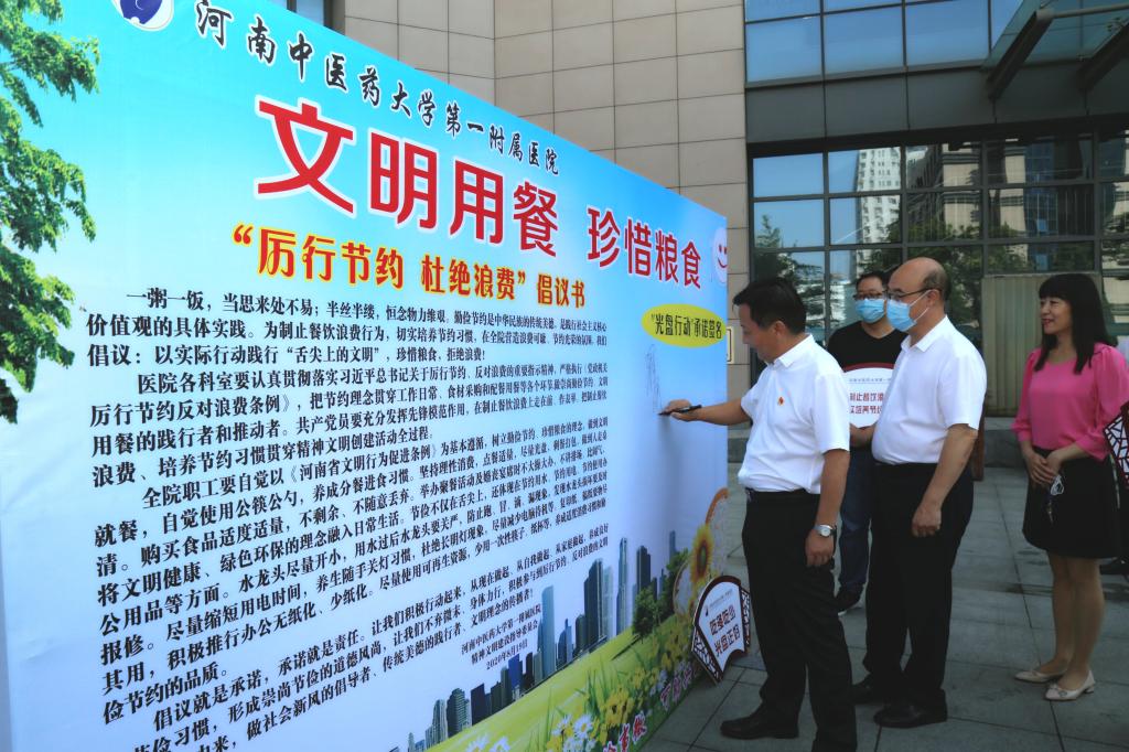 在签名仪式中,翟剑波等医院领导率先在承诺处签名,表示将以实际行动率先垂范,带领全院职工认真贯彻落实习近平总书记的重要指示精神,积极参与到厉行节约、反对浪费的各项行动中。现场参会职工也争相签名承诺,纷纷表示将响应医院倡议,自觉以《河南省文明行为促进条例》为基本遵循,树立勤俭理念、养成节约习惯,把珍惜粮食、勤俭节约的优良传统发扬光大,为建设节约型医院和社会做出努力和贡献。