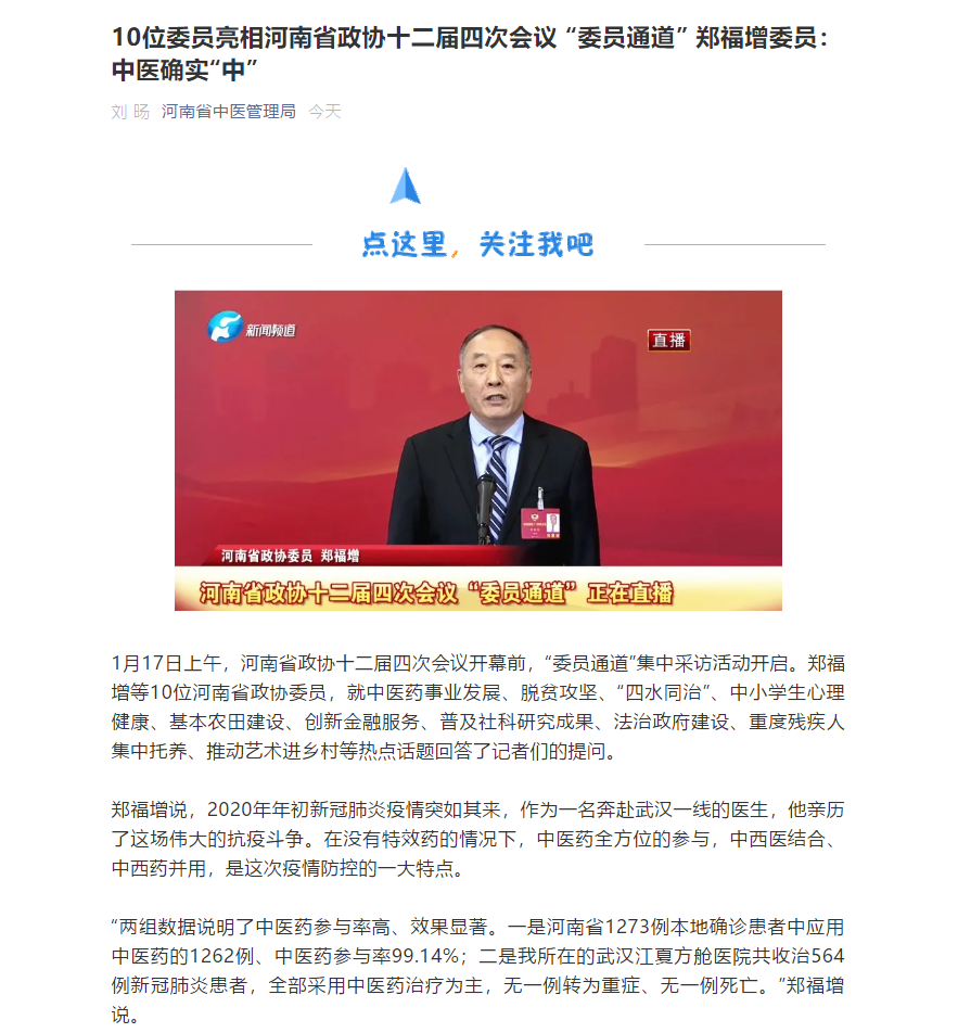 河南省中医管理局、大河网丨【委员通道】从“中医黑”到“中医粉” 郑福增用方舱医院的一个故事来传递中医自信