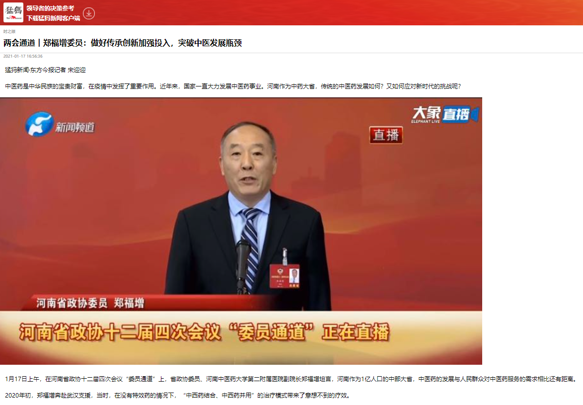 2021年1月17日,大河网、猛犸新闻等媒体对河南省政协委员、我校二附院副院长郑福增:做好传承创新加强投入,用方舱医院的一个故事来传递中医自信进行报道。