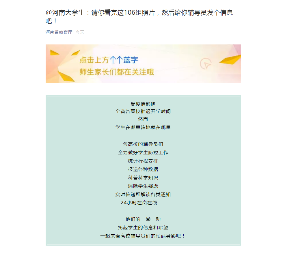编者按:2020年2月17日,河南省教育厅官方微信对我校辅导员全力做好学生防控工作进行报道。现将部分文章刊发如下: