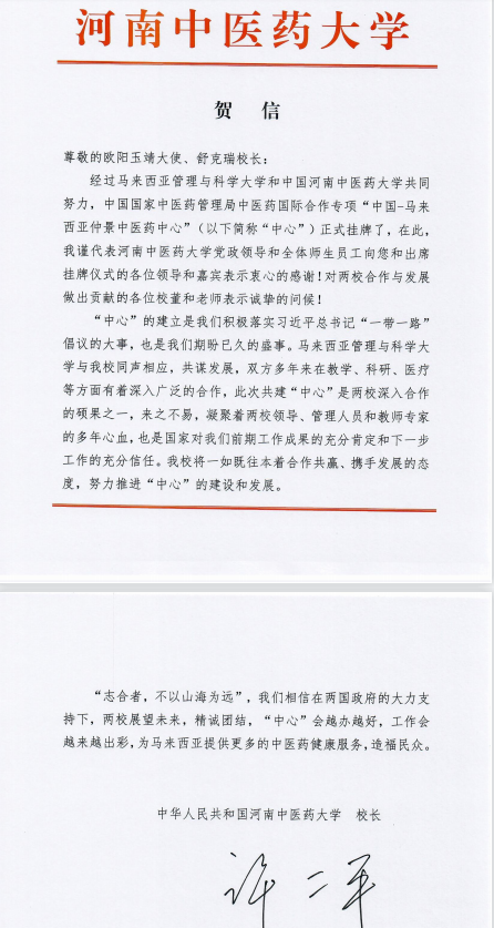 “中国-马来西亚仲景中医药中心”是我校2020年和2021年申请的国家中医药管理局中医药国际合作专项中心类项目,项目成功获批后,双方开展了卓有成效的合作。此次揭牌仪式,展现了马来西亚管理与科学大学对中医药的重视,欧阳玉靖大使对此充分认可,对马来西亚积极参与“一带一路”倡议给予了高度评价,对“一带一路”论坛的启动给予了美好的祝愿,很高兴见到中马两国借助“一带一路”论坛系列活动平台在教育、科研等方面深入合作取得更加丰硕的成果。舒克瑞校长高度评价了我校与管理与科学大学开展的合作办学项目,强调两校在基础设施建设、教育与科研等诸多方面都开展了深入的合作。通过中心工作的开展,有效提高了中医药在马来西亚的知名度,为中医药在马来西亚的更好发展进一步夯实了基础。