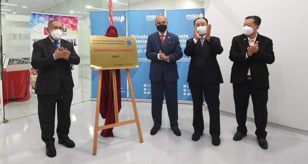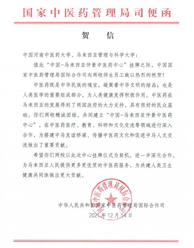本网讯(文/赵俊卿 图/李敬平)2021年12月14日,“中国-马来西亚仲景中医药中心”揭牌仪式在马来西亚管理与科学大学主校区隆重举行。在中华人民共和国驻马来西亚特命全权大使欧阳玉靖先生和马来西亚一带一路协会会长拿督斯里Chuah Poh Khiang的见证下,马来西亚管理与科学大学校长舒克瑞与大学附属医院院长拿督莱拉诺教授共同为“中国-马来西亚仲景中医药中心”揭幕。国家中医药管理局国际合作司向我校发来贺信。