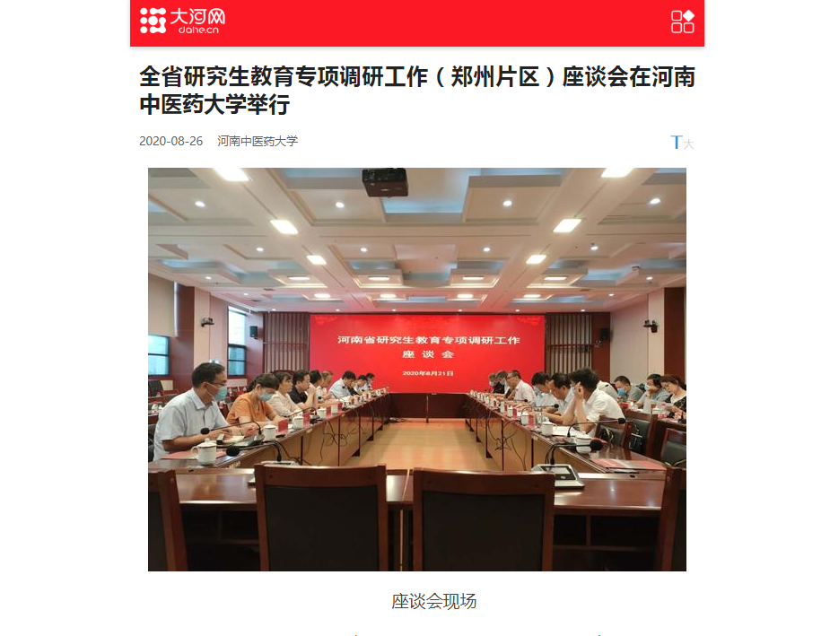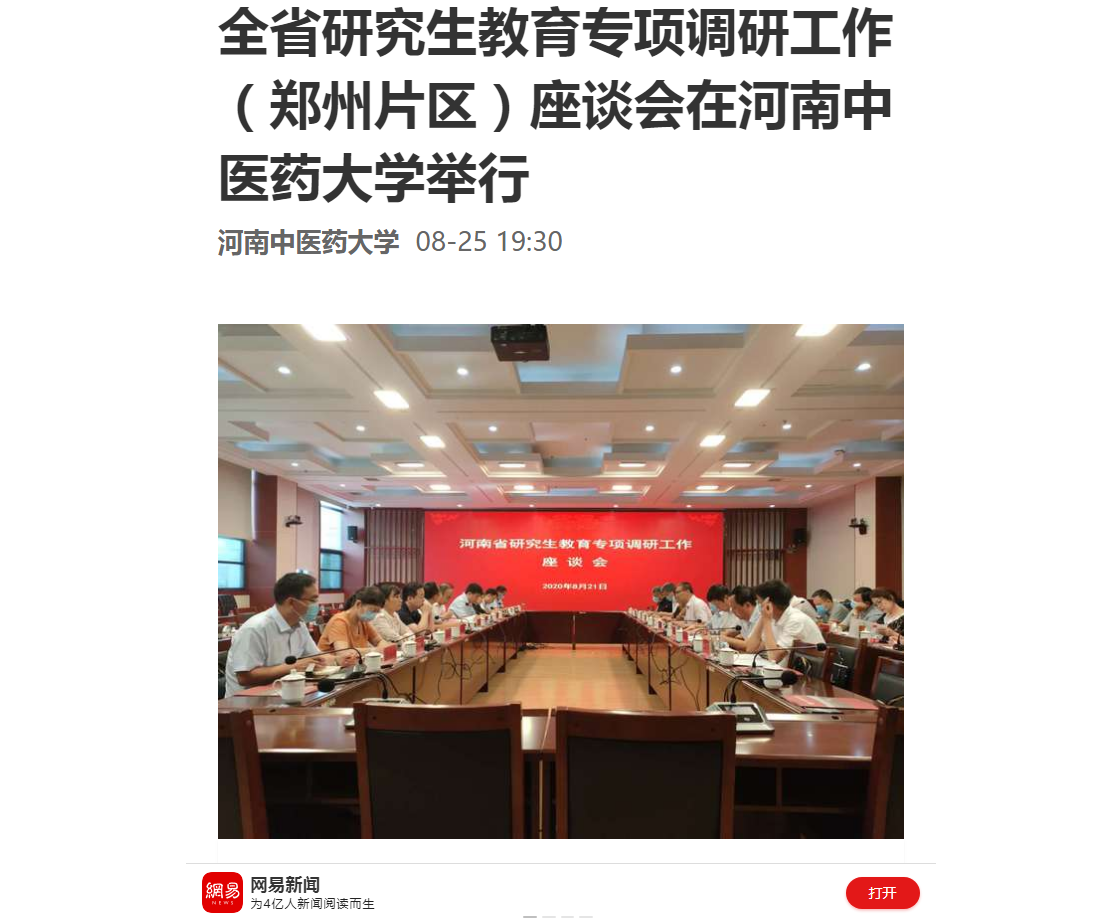 2020年8月25日,大河网、网易新闻对全省研究生教育专项调研工作(郑州片区)座谈会在我校举行进行报道。