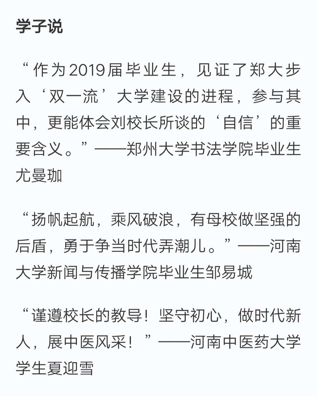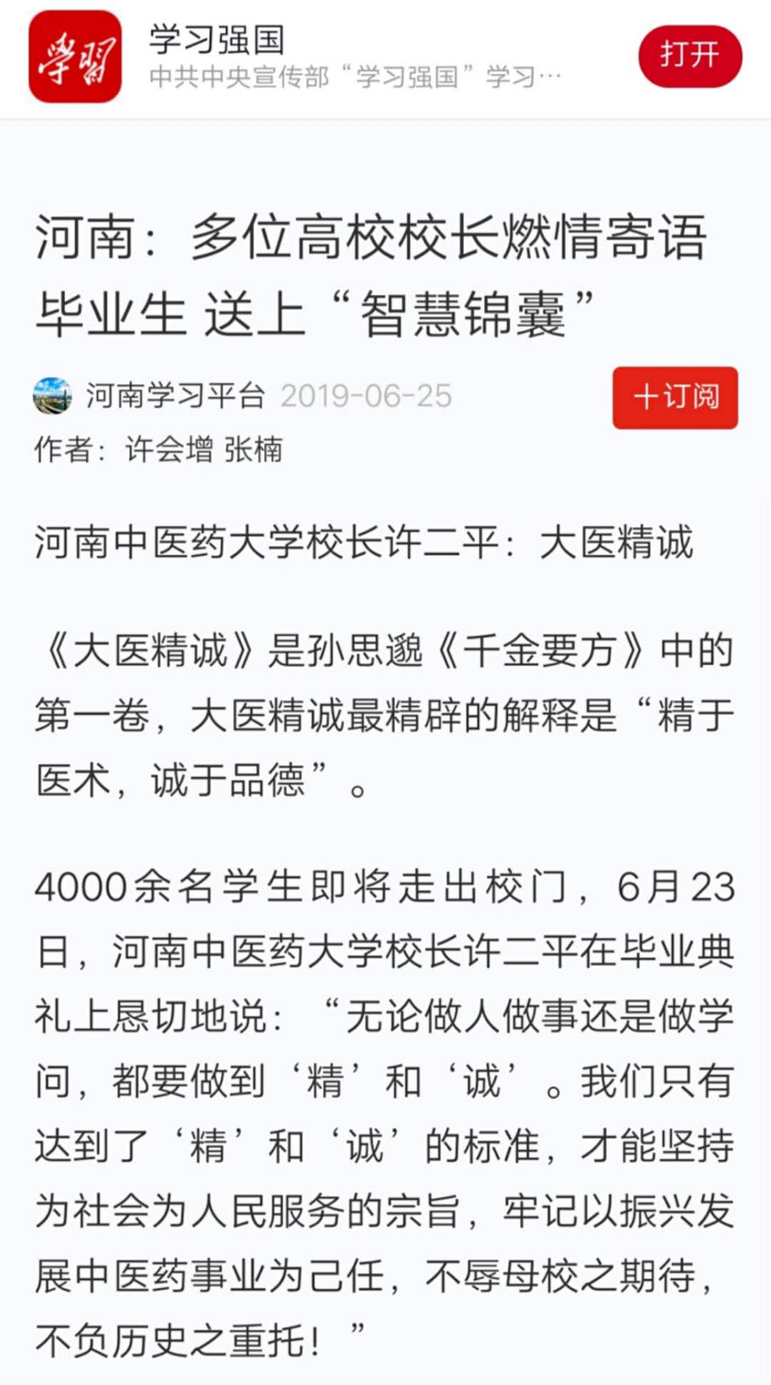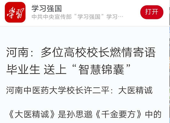 编者按:2019年6月25日,“学习强国”学习平台以“河南:多位高校校长燃情寄语毕业生 送上‘智慧锦囊’”为题,对许二平校长在我校2019年毕业典礼上对毕业生的深情寄语进行了报道。现将报道全文刊发如下。