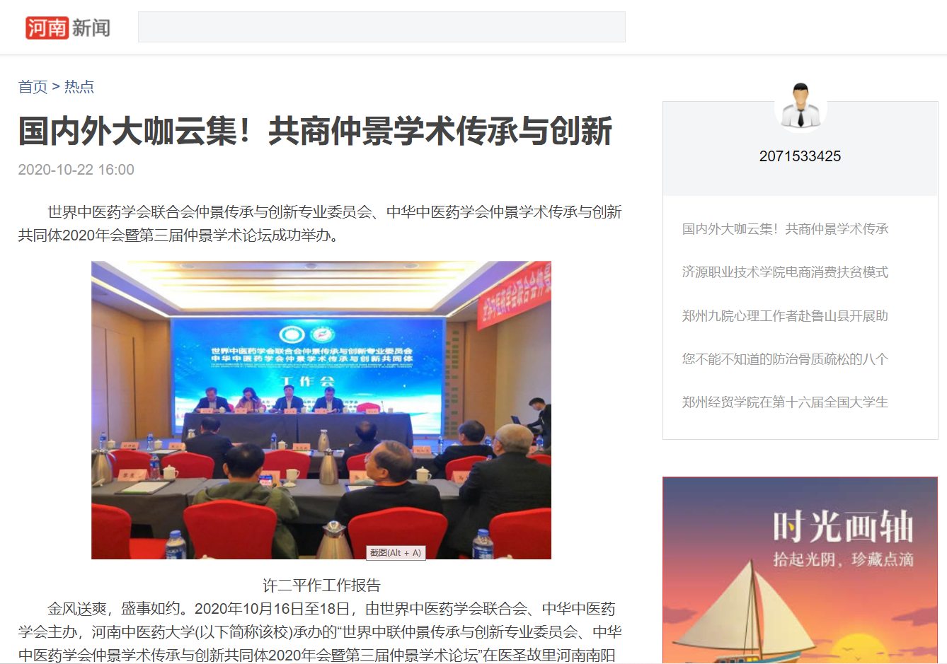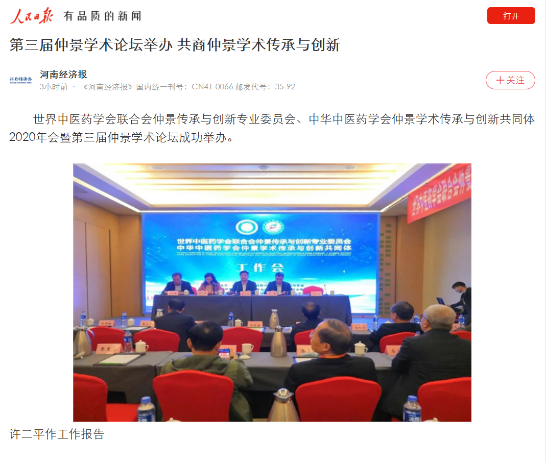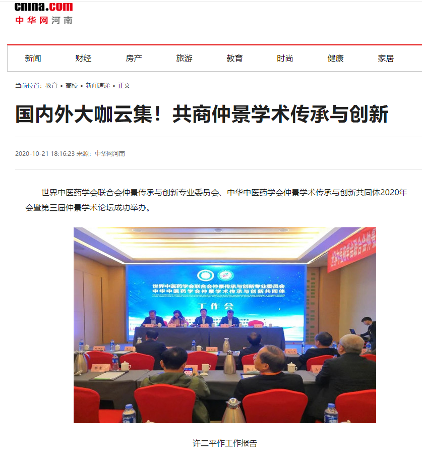 编者按:2020年10月22日,人民日报、中华网、河南高校资讯网、中华高校网、河南新闻网、搜狐网等多家媒体对我校承办的世界中联仲景传承与创新专业委员会、中华中医药学会仲景学术传承与创新共同体2020年会暨第三届仲景学术论坛进行广泛报道。