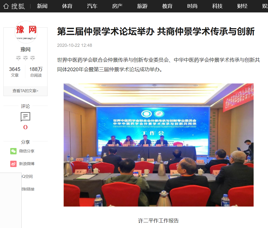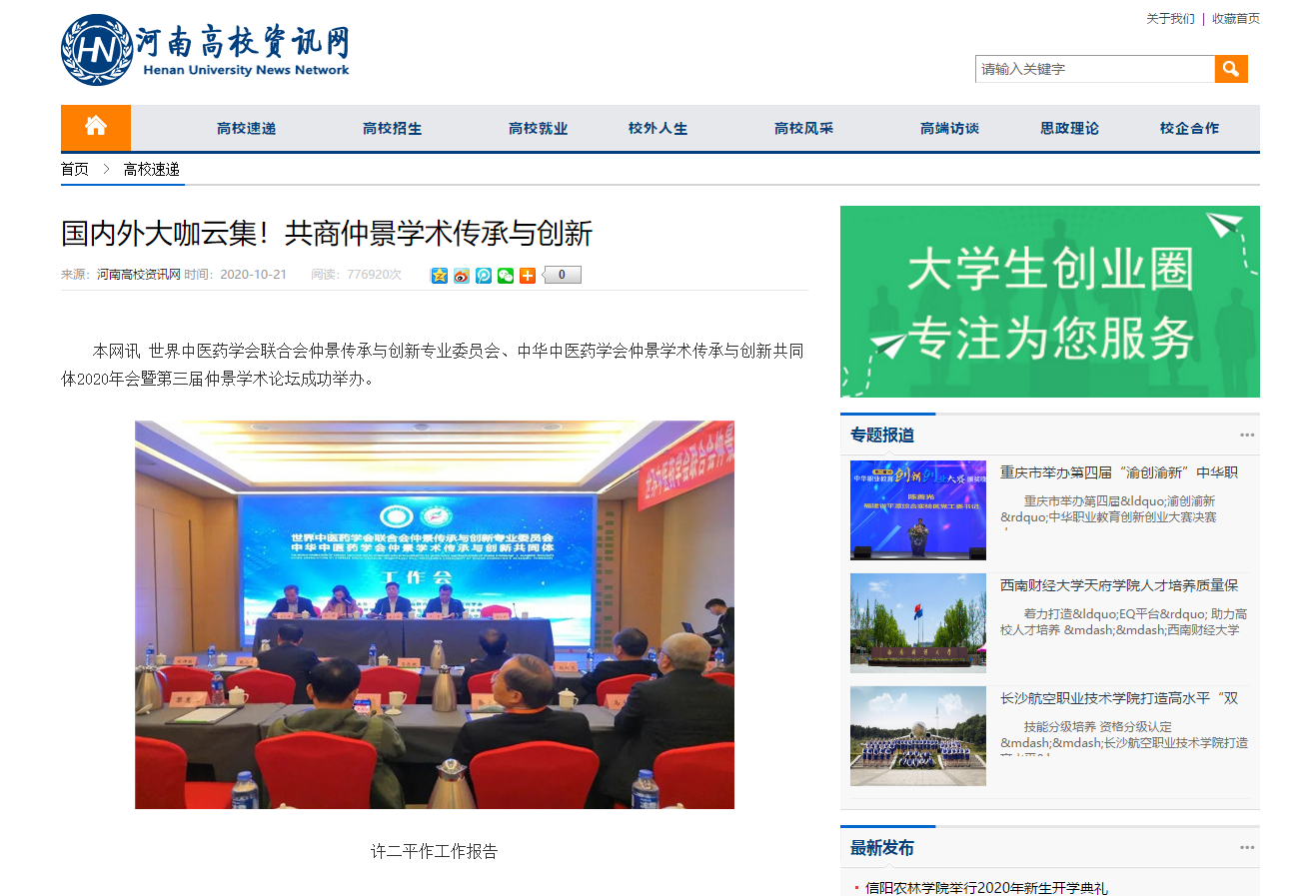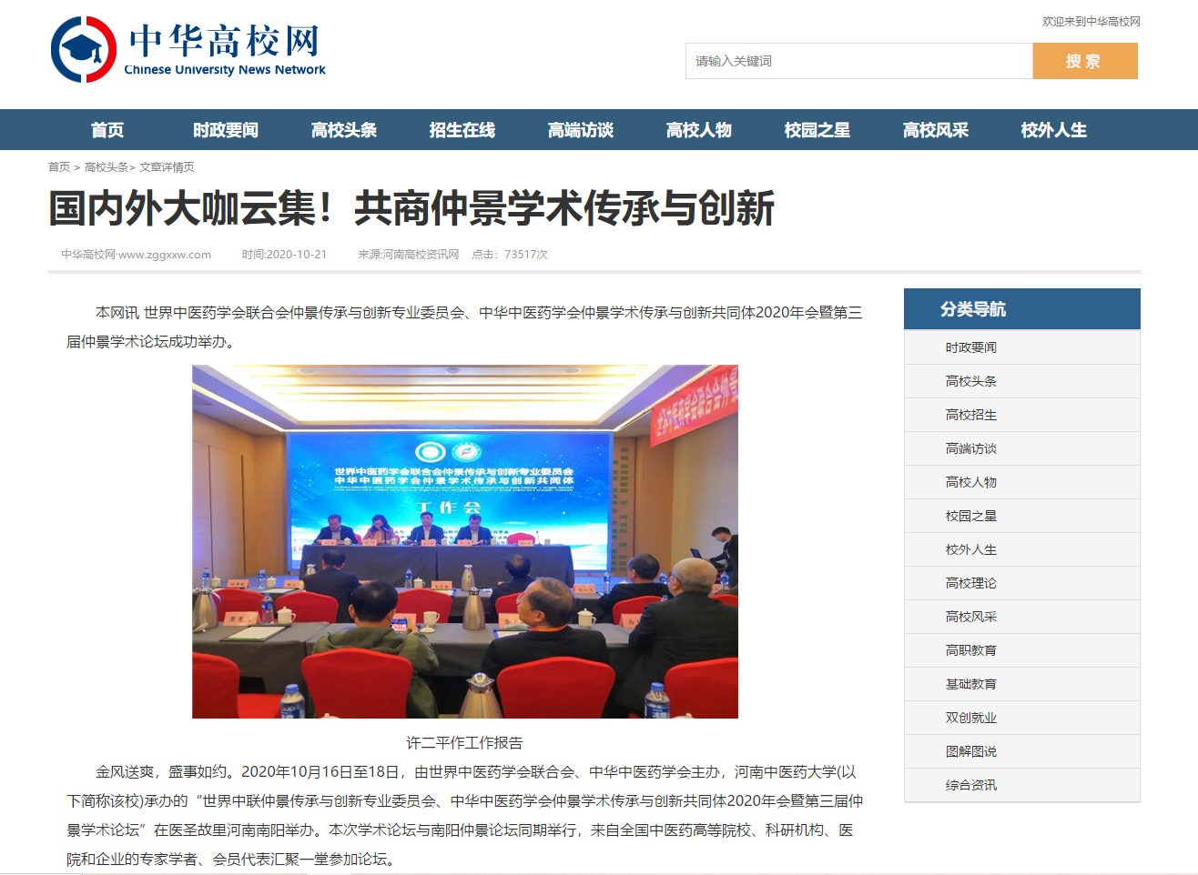 编者按:2020年10月22日,人民日报、中华网、河南高校资讯网、中华高校网、河南新闻网、搜狐网等多家媒体对我校承办的世界中联仲景传承与创新专业委员会、中华中医药学会仲景学术传承与创新共同体2020年会暨第三届仲景学术论坛进行广泛报道。