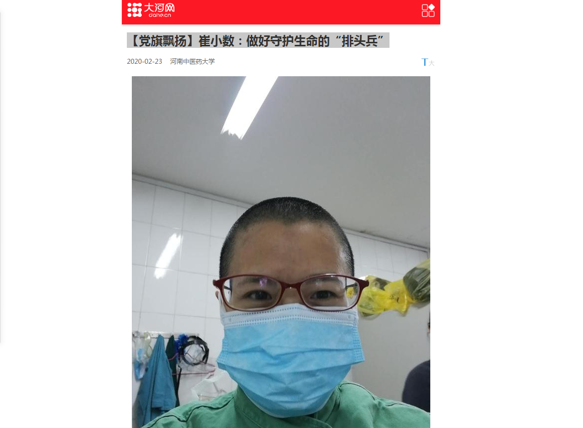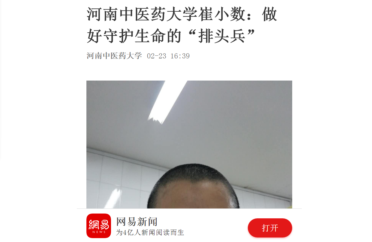 编者按:2020年2月23日,大河网、网易新闻分别以《【党旗飘扬】崔小数:做好守护生命的“排头兵”》《亚盈app(中国)官方网站崔小数:做好守护生命的“排头兵”》为题,对我校2017级方剂学专业研究生崔小数的故事进行报道。