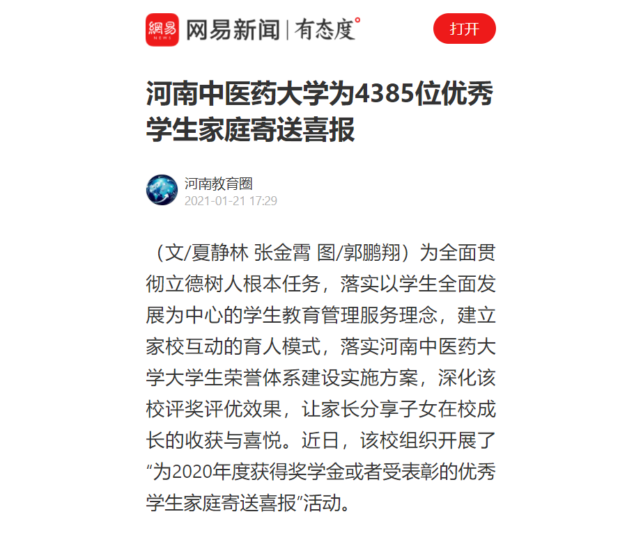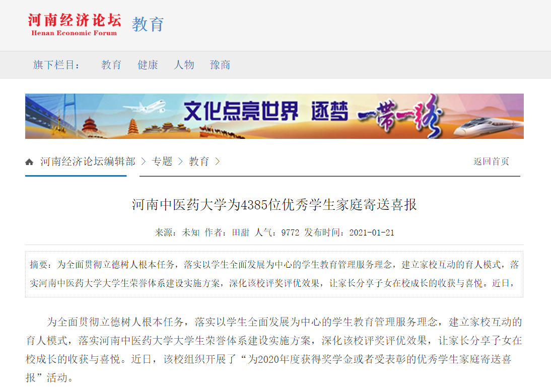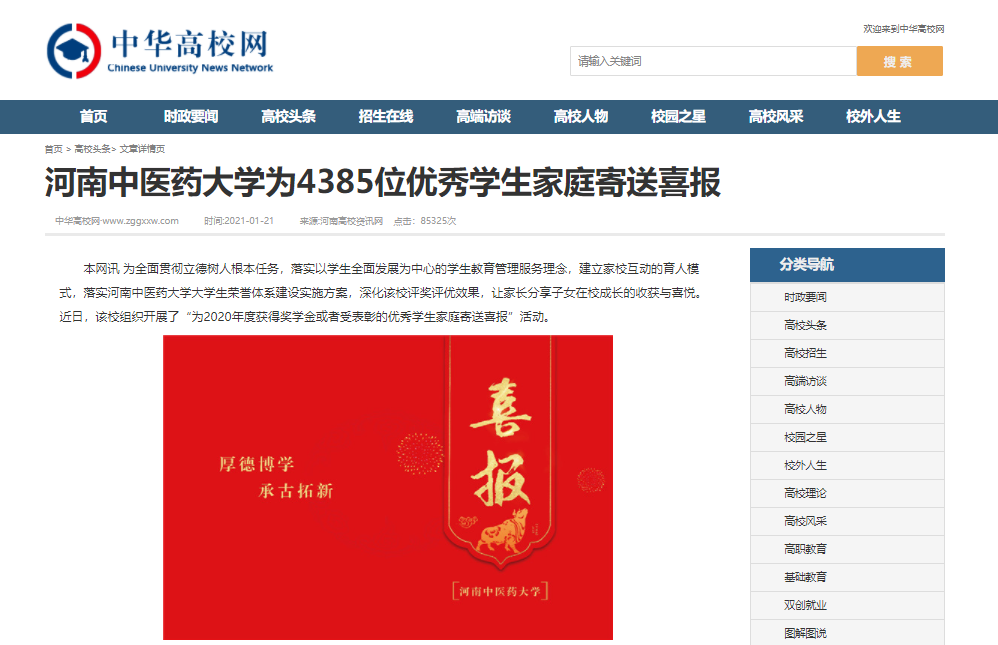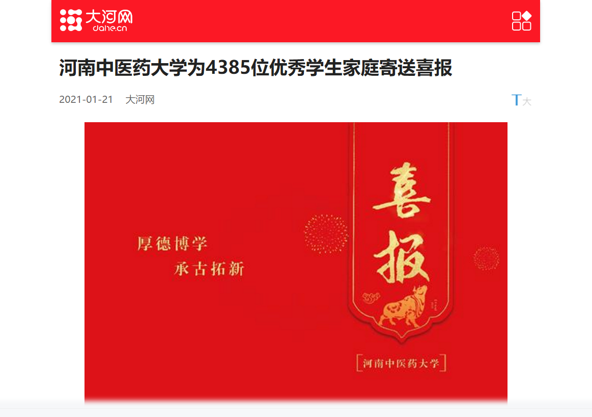 编者按:2021年1月21日,中国网、大河网、中华高校网、中新资讯网、河南高校资讯网、新豫网、河南经济论坛、网易新闻、新浪新闻等多家媒体对我校为4385位优秀学生家庭寄送喜报进行报道。