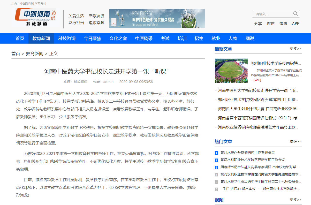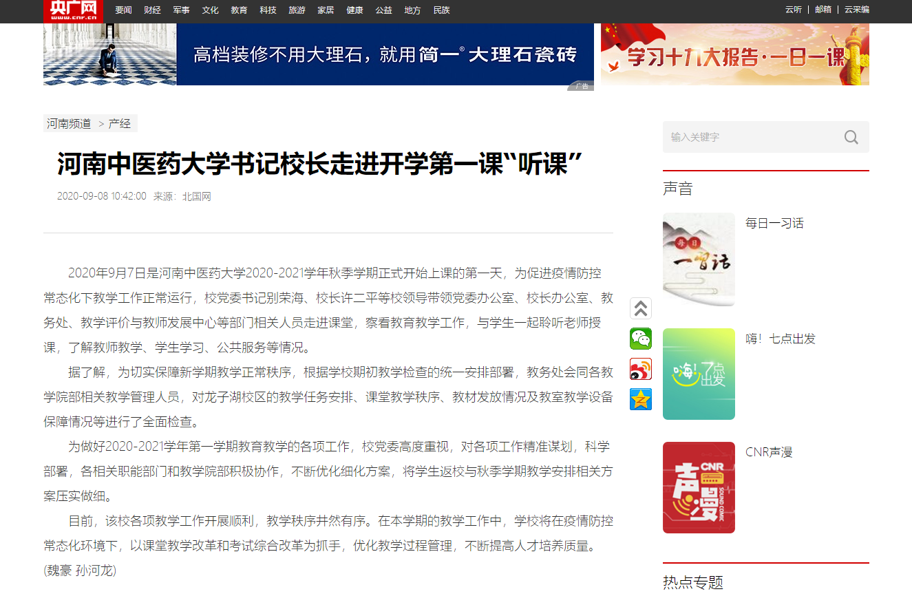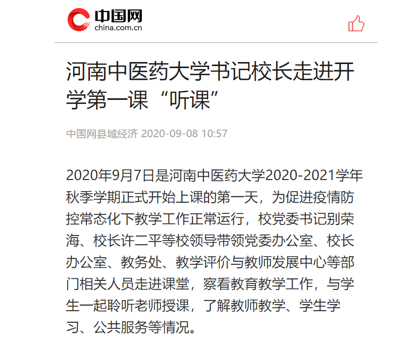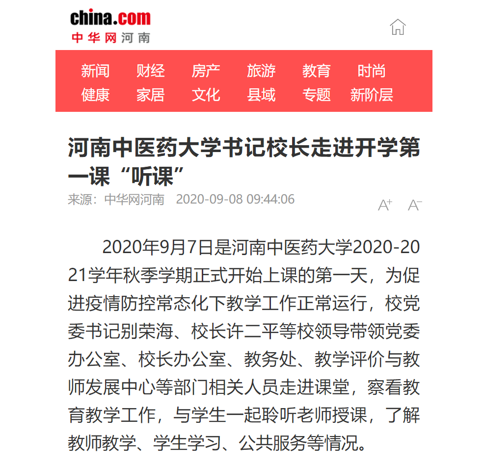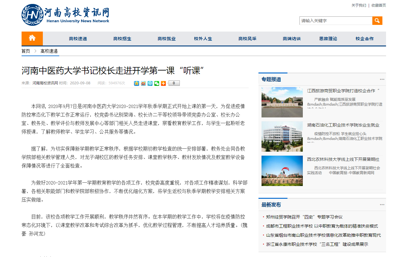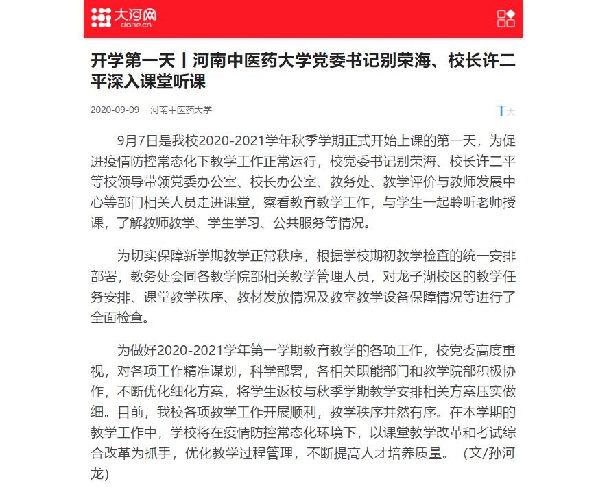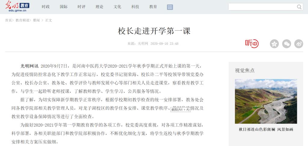编者按:2020年9月8日-10日,光明网、央广网、中国网、大河网、中华网、北国网、中新河南网、河南高校资讯网等多家媒体对我校党委书记别荣海、校长许二平走进开学第一课“听课”进行报道。