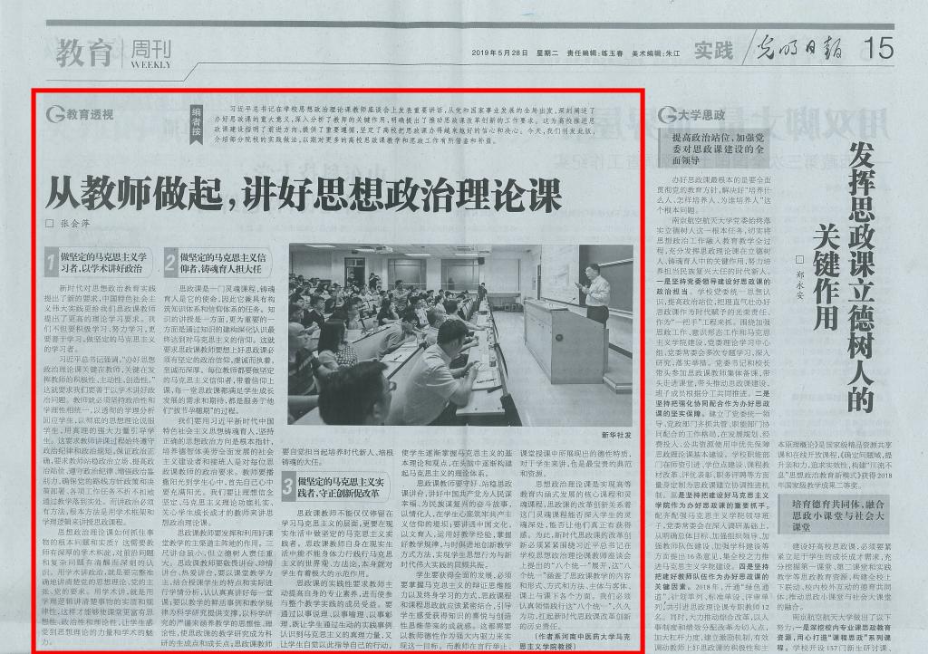 本网讯(文图/苗丹阳)2019年5月28日,《光明日报》刊发了我校马克思主义学院院长张会萍教授《从教师做起,讲好思想政治理论课》的文章,对我校思政课的实践、探索和成效进行报道。现将报道全文刊发如下:
