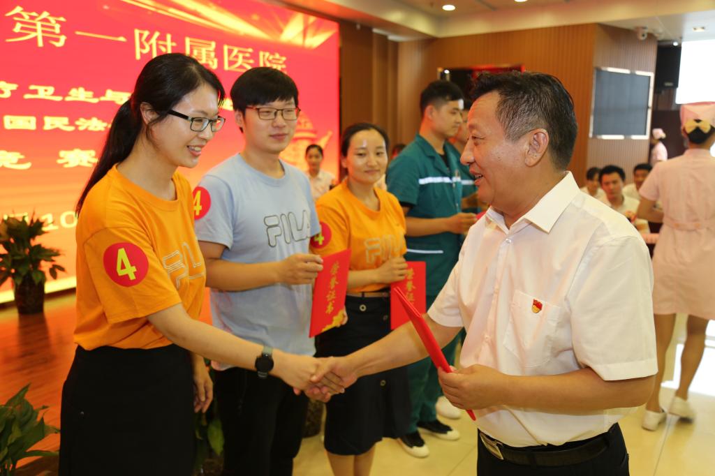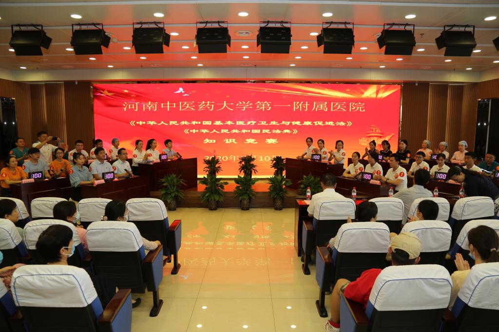 本网讯(文/何世桢 图/魏佳琳)2020年7月10日,我校一附院组织开展了《中华人民共和国基本医疗卫生与健康促进法》《中华人民共和国民法典》知识竞赛,作为庆祝建党99周年系列活动之一,本次活动旨在进一步增强全院职工的学法用法意识。医院党委书记翟剑波、党委副书记张晓东、工会主席张婉红、各党总支书记及党员职工代表参加。来自医院各党总支、直属党支部的33名职工组成11支代表队参加竞赛,比赛中,队员们斗志昂扬,现场气氛积极热烈,达到了以赛促学目的。